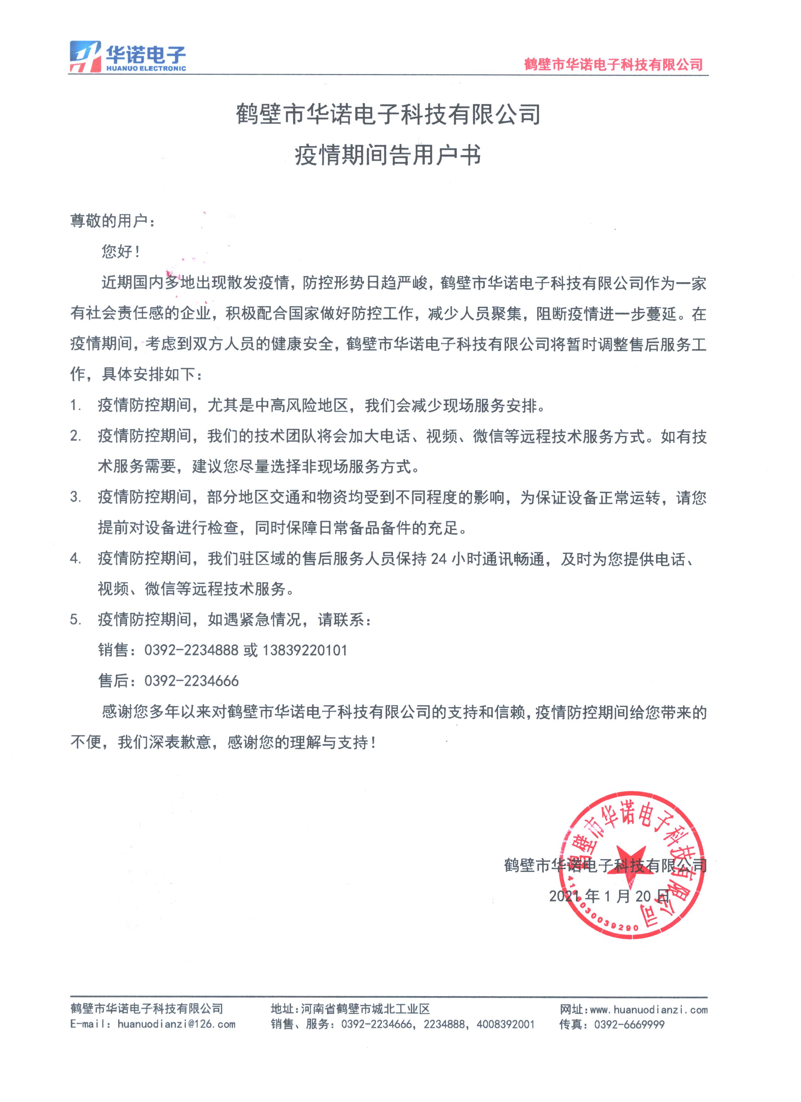 感謝您多年以來對(duì)鶴壁市華諾電子科技有限公司的支持和信賴,疫情防控期間給您帶來的不便,我們深表歉意,感謝您的理解與支持!