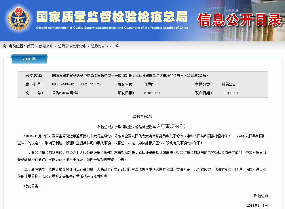最新消息!質(zhì)檢總局關(guān)于取消制造、修理計(jì)量器具許可事項(xiàng)的公告